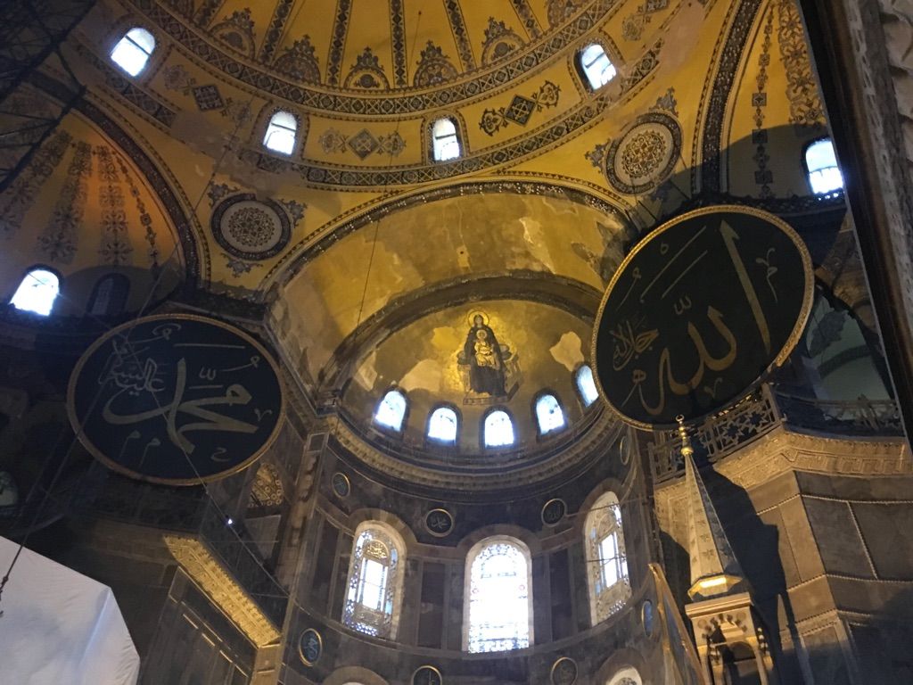 キリストのモザイク像とアッラーやモハメッドの名を金色で記した円盤が同居している。