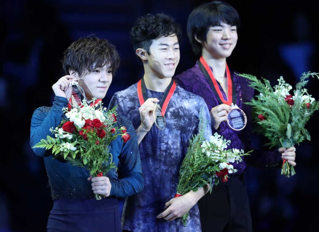表彰台に上ったのは、金メダルのネイサン・チェン選手、銀メダルの宇野昌磨選手、銅メダルのチャ・ジュンファン選手でした。