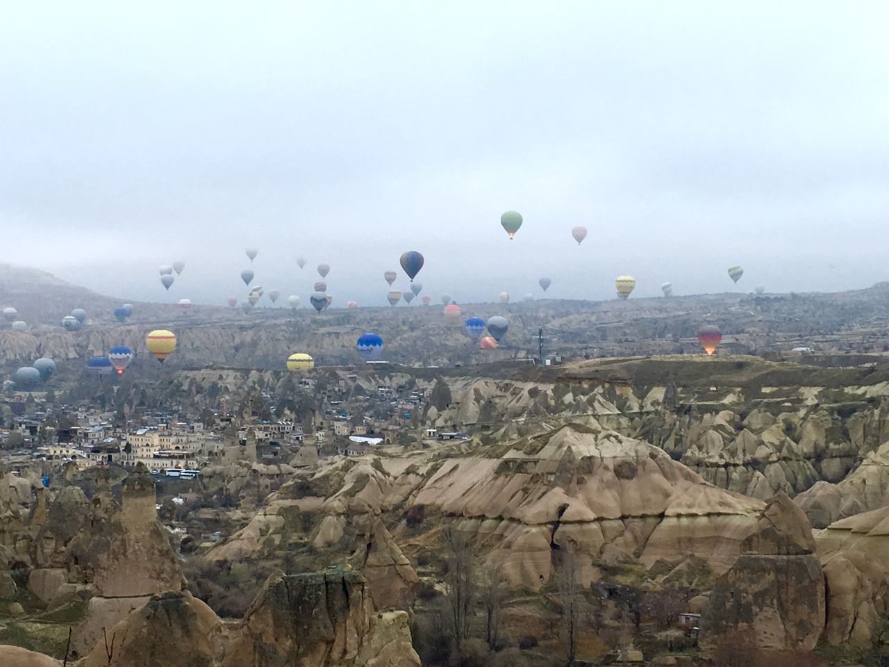 早朝にはホテルのテラスから、奇岩の上空に上がって行く気球を見ることができました。