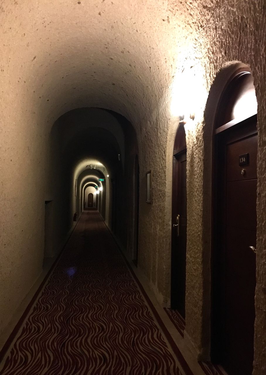 廊下もお部屋も、壁は全て天然の岩をくりぬいた造りです。