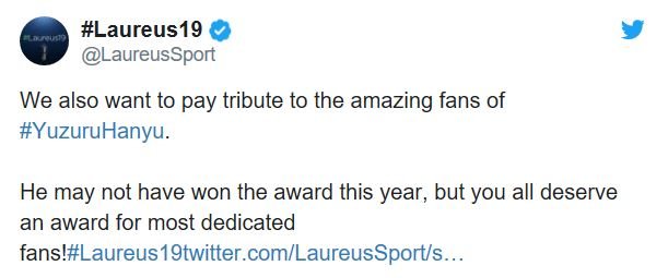 羽生結弦様自身からのメッセージがある。#Laureus19#YuzuruHanyu fans, we've heard you on Twitter...