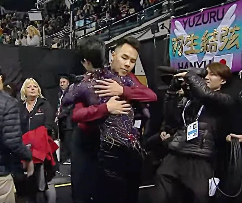 最終滑走を滑る直前に、リンクから戻った結弦くんとがっちりハグしてリンクに向かいました。