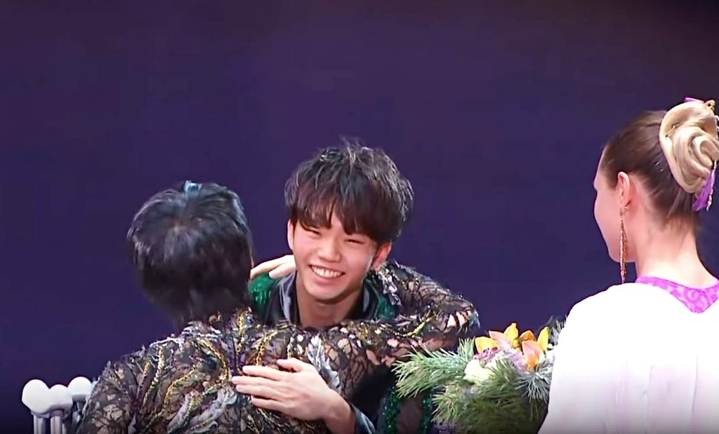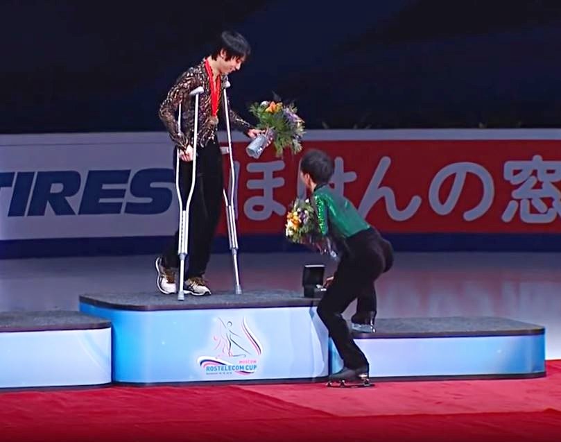 フリー直前に怪我をしてしまい、それでもその場で直ちにジャンプ構成を組みなおして強行出場し、優勝を勝ち取った羽生選手と共に上った表彰台でのことです。