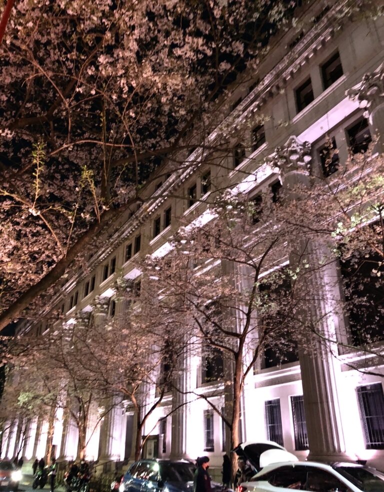 三井ビルのコリントスタイルの列柱をバックにした桜並木は、ライトアップされた夜がいい。
