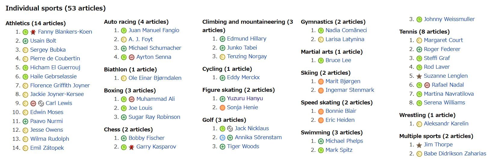 膨大なWikipediaの項目の中から、個人スポーツジャンルでは53人だけというのは、本当に厳選されたアスリートだけということです。