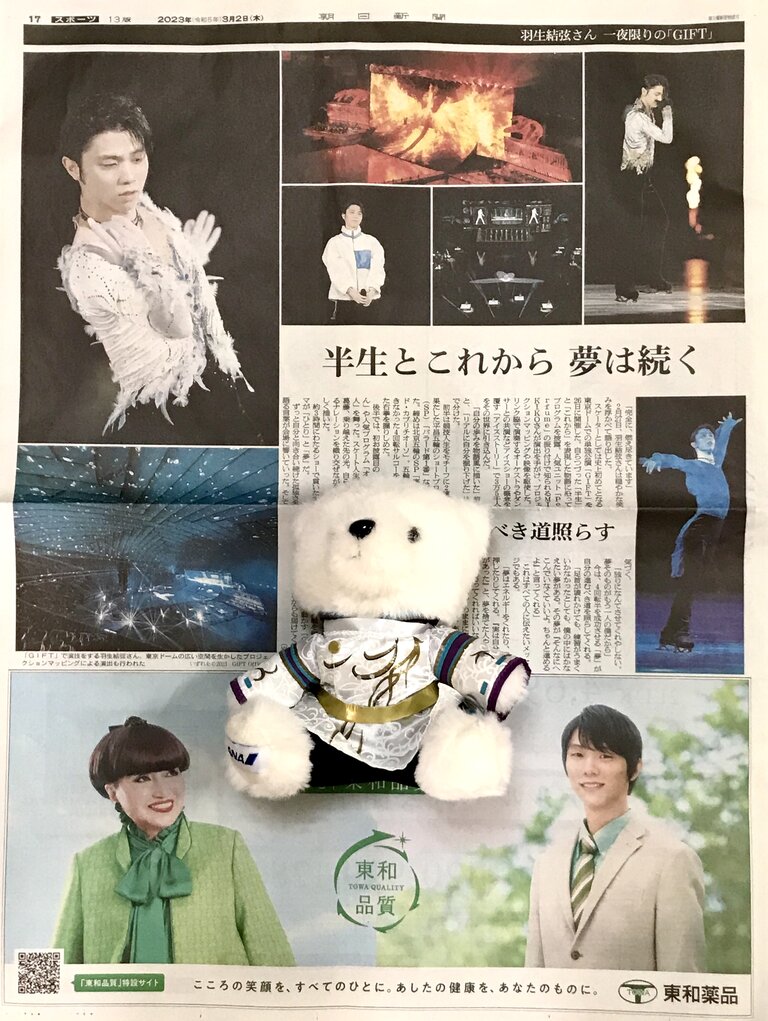 スケーターとしては史上初めてとなる東京ドームでの単独公演「GIFT」を26日に開催した。自らつづった「半生」と「これから」を表現した物語に沿ってプログラムを披露。人気ユニット「Perfume」の振り付けで知られるMIKIKOさんが演出を手がけ、プロジェクションマッピングや映像を駆使した。リンク脇で演奏するオーケストラやダンサーとの共演などアイスショーの概念を覆す「アイスストーリー」で3万5千人をその世界に引き込んだ。