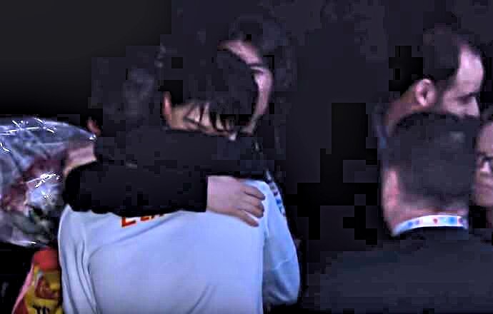 暗闇の中でハビエル選手が近づき羽生選手を抱きしめハグを交わします。