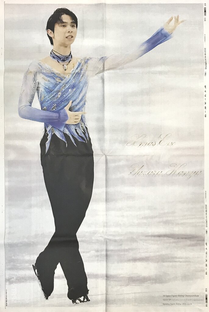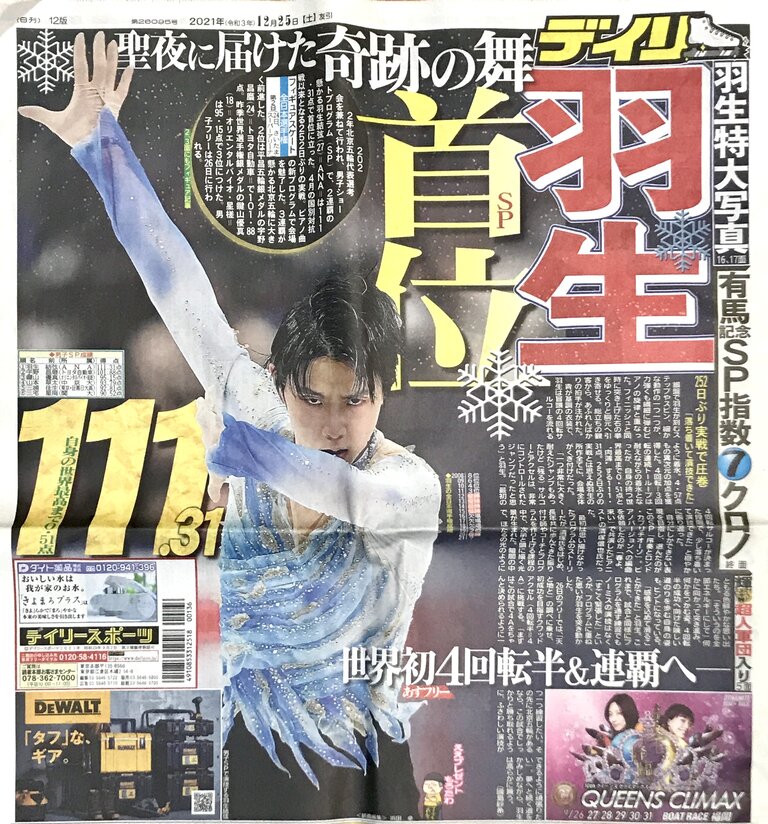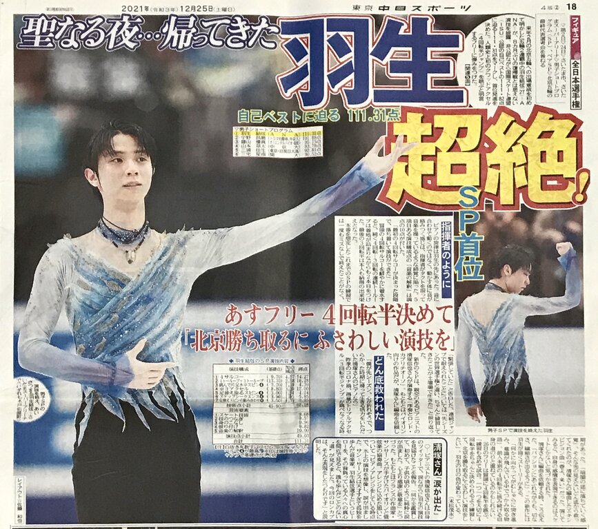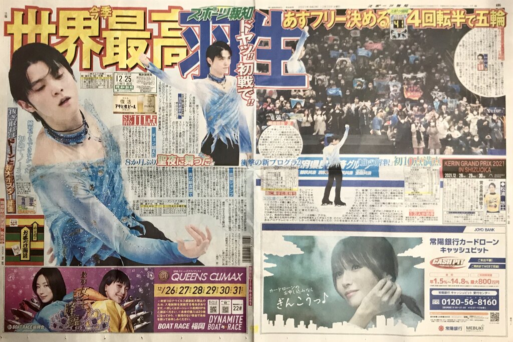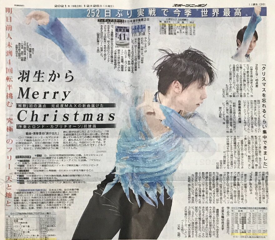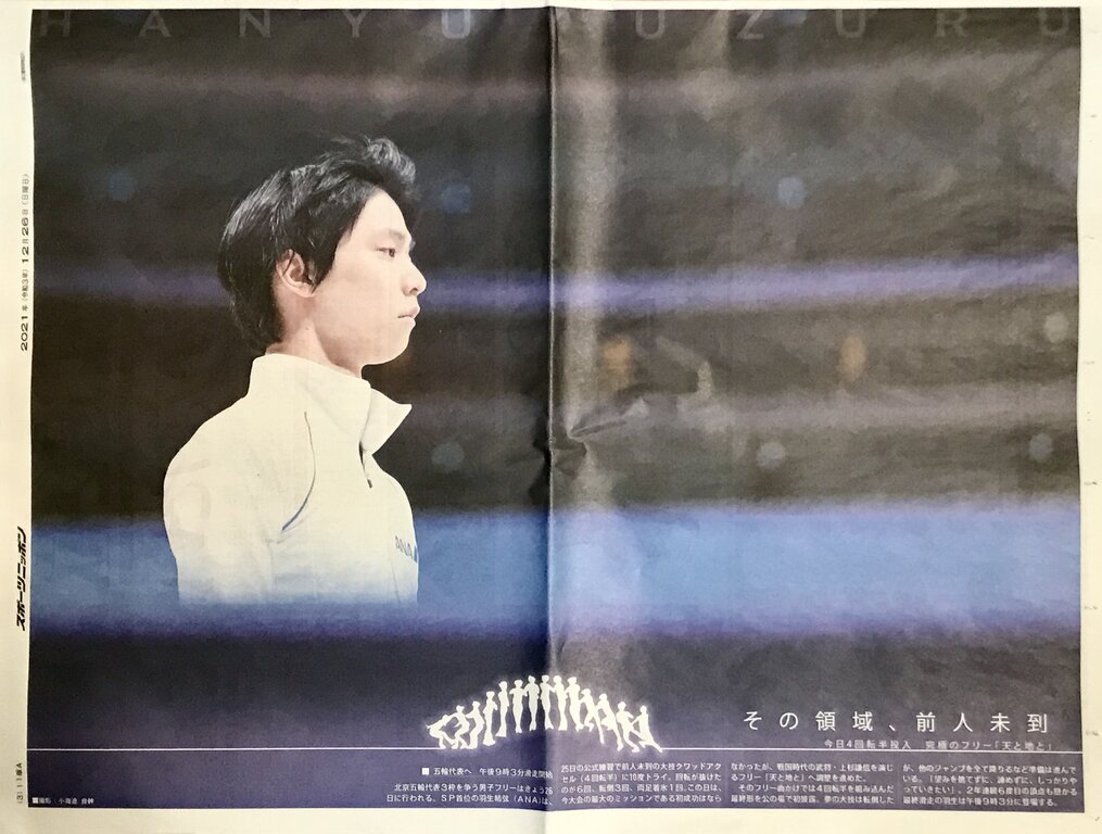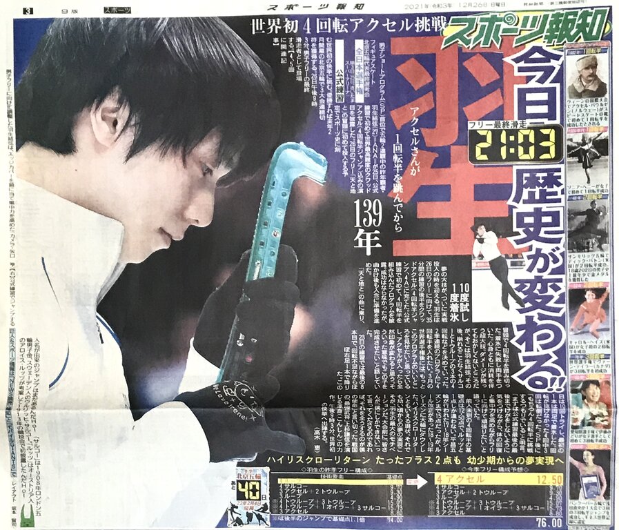 写真は本日12月21日付スポーツ報知2ページ見開き面で掲載の #羽生結弦 選手。