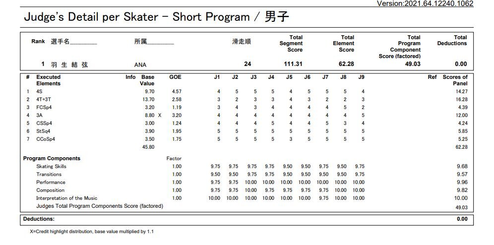 それは4Aが回転不足のため、3Aの基礎点とされ、さらに、転倒もしていないのにも関わらず、9人中7人のジャッジがー5という大きな減点をしていたからです。