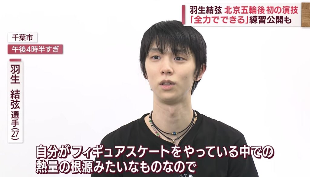 羽生結弦選手:「(Q.北京五輪以来となる演技の舞台だが?)右足首のけがが自分が思っているより大きくて、うまく練習できない日々もあったんですけど、だいぶ落ち着いてきましたし、まだ完治ではないですけど、しっかりケアしながら付き合いながら全力で演技できるところまではきました」