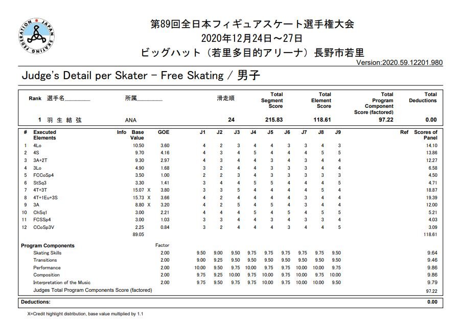動画を見る前に、全日本の2020年と2021年の羽生選手のFSのプロトコルを今一度ご覧ください。