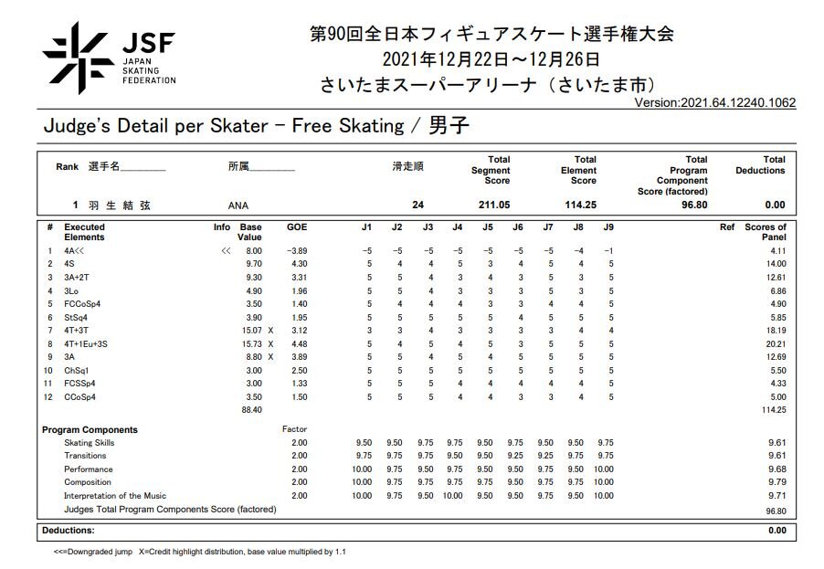 それは4Aが回転不足のため、3Aの基礎点とされ、さらに、転倒もしていないのにも関わらず、9人中7人のジャッジがー5という大きな減点をしていたからです。