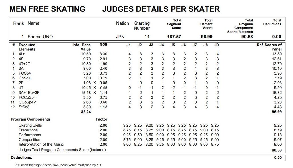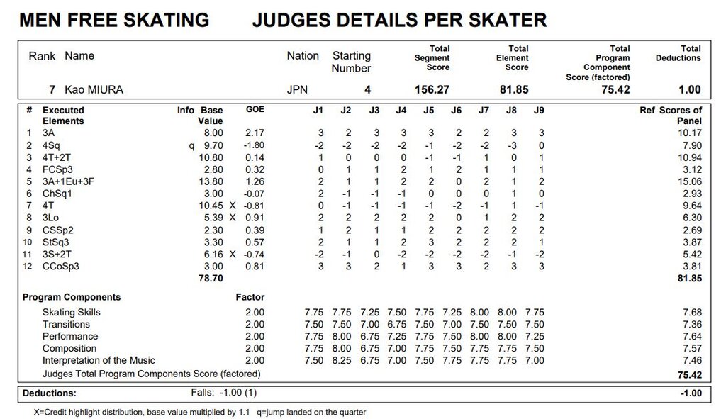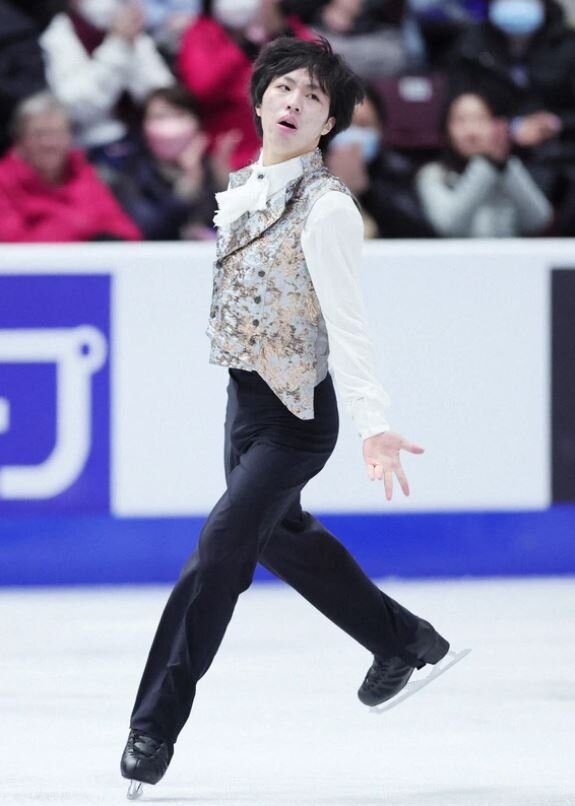 冒頭にGOE(出来栄え点)3・78点と質の高い4回転ルッツを決めると、4回転―2回転の連続トウループ、単発の4回転トウループを成功。トリプルアクセル(3回転半ジャンプ)も2本降りるなど、全7本のジャンプを大きなミスなくまとめ上げた。圧巻の演技内容に、観客からも大きな拍手。自己ベストに迫る高得点で、キスアンドクライでは笑顔を見せた。