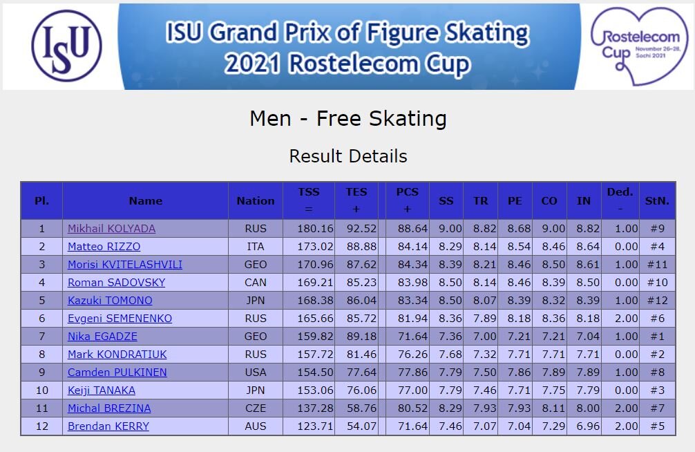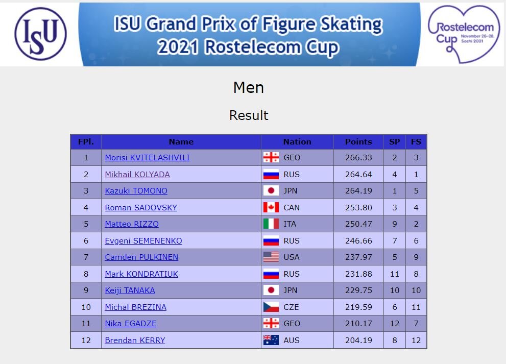 こちらは、先程終わったロステレコム杯男子シングルFSの結果です。