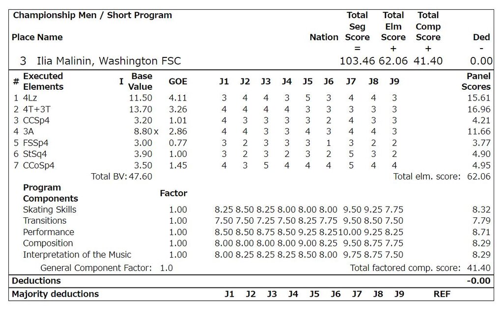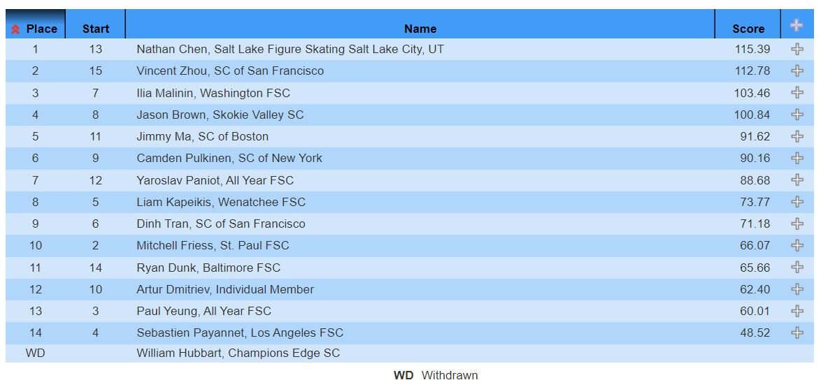 こちらは、日本時間で早朝に行われた全米フィギュアの男子SPの結果です。