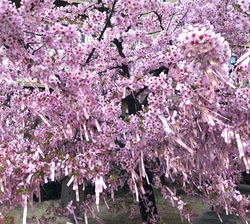 桜の木には、お願い事を書いたリボンがたくさん結び付けられていて、濃いピンクの花を一層華やかに飾っていました。