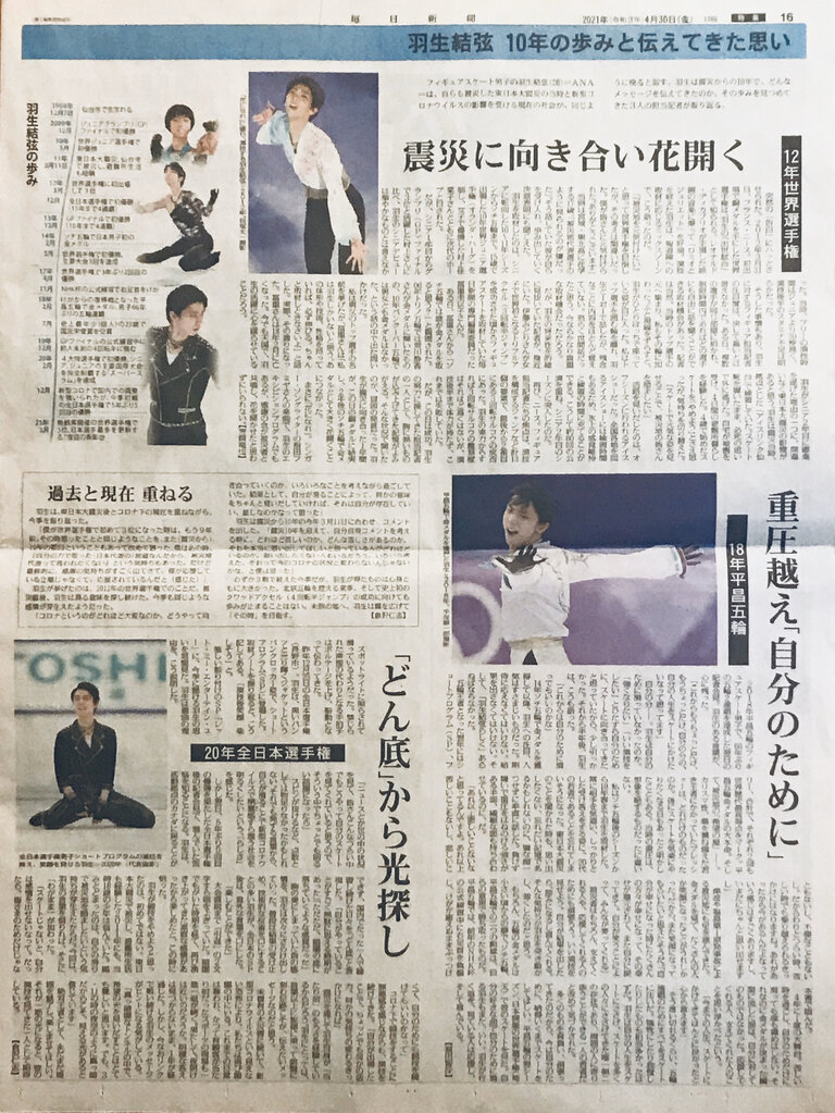 本日の毎日新聞に3人の記者が見つめた #羽生結弦 選手の10年が掲載されています。