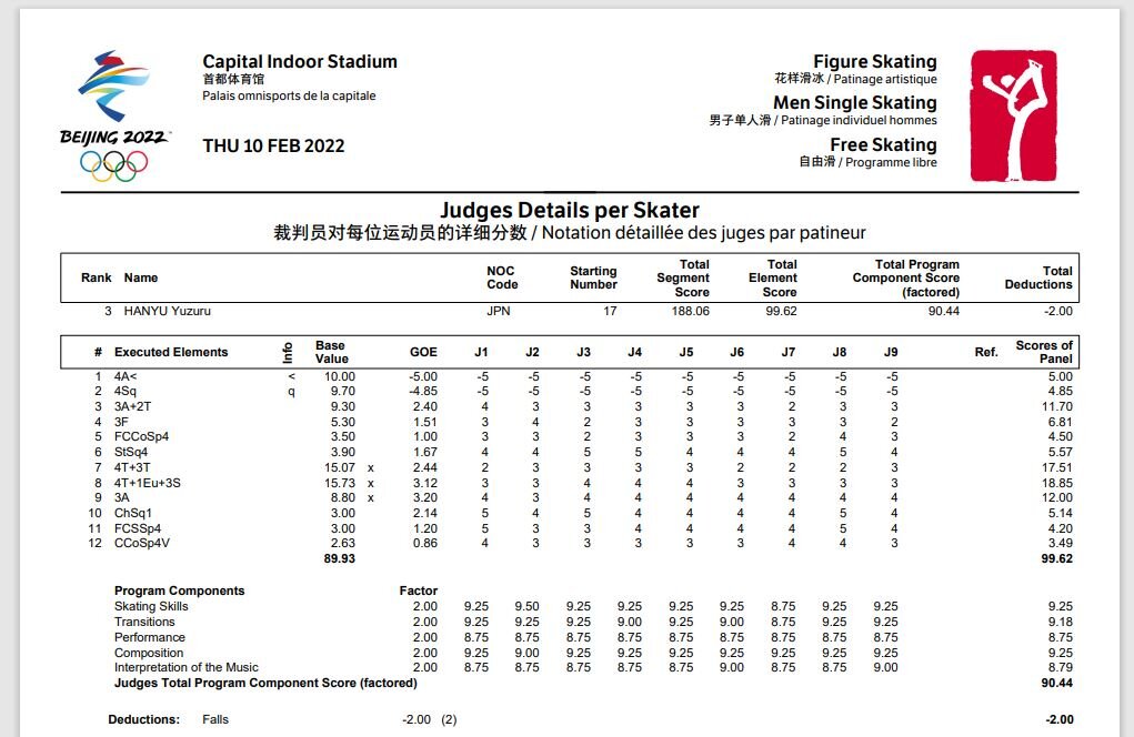 これまでも羽生選手はしばしばいわれのない下げ採点をされてきましたが、今回も改めてプロトコルや結果詳細表を見るとおかしな点が多々見えてきます。